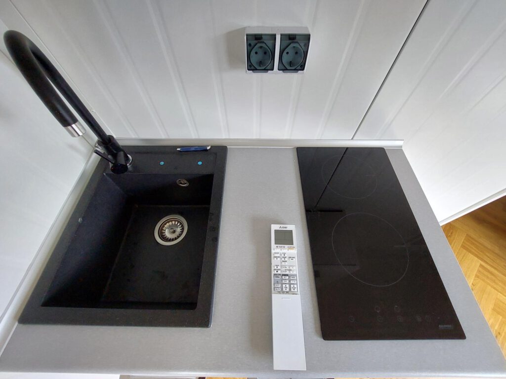 -Sanitaire voorzieningen: Keuken inclusief koelkast en vriesvakje, wasbak en kookplaat met twee witte kastjes 1000 x 600mm 1x, toilet, wasbak, boiler van 100L, elektrische radiator, douche, aan en afvoer via de wand