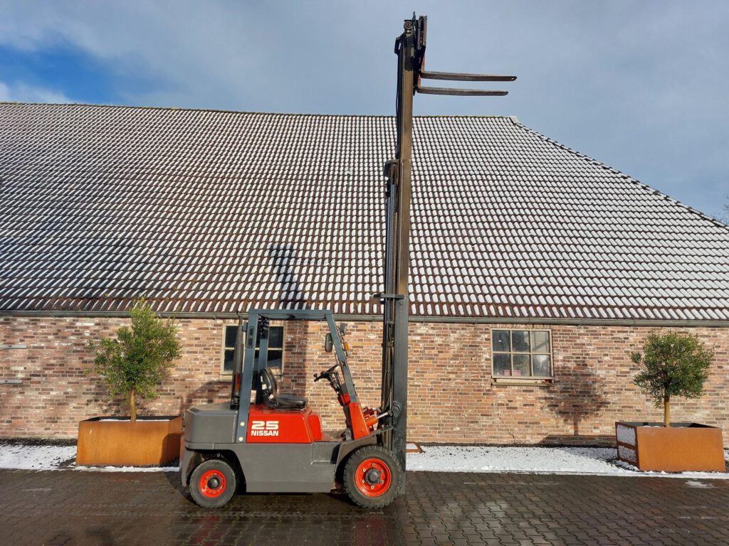 Nissan FD25 Heftruck, bouwjaar 2000, uren 9027, driedelige mast 470cm, sideshift, 3e functie, besturing speling vrij, banden 70% goed, recent accu + startmotor vervangen, lekvrij, tech. 100%, al 15 jaar in ons bezit en onderhouden!
